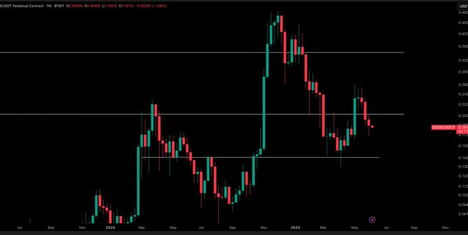 Crypto analyst Crypto Tony has shared a technical perspective on DOGE, specifically the DOGE/USDT pair. Based on a chart shared on the 1-week timeframe, the token is currently testing a key support area at $0.18. This level has historically acted as both resistance and support, making it a critical point for future price movements.