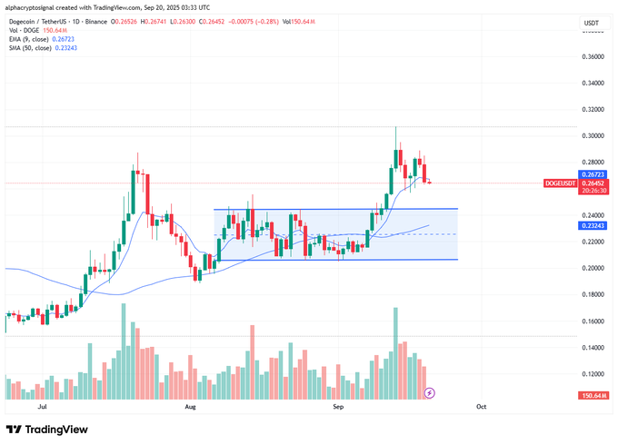 - Dogecoin broke out from $0.22–$0.24 consolidation, supported by rising trading volume and renewed market participation.