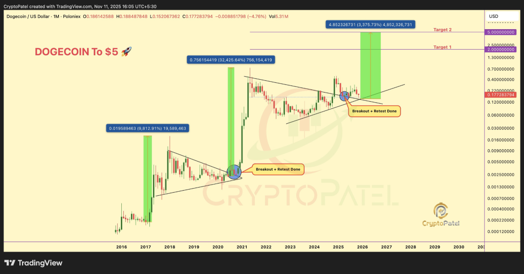 - Dogecoin's chart setup points to a potential 10x to 33x rally, targeting $2 to $5.