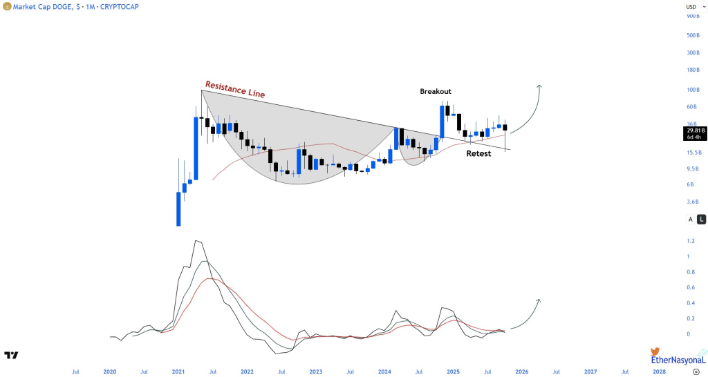Dogecoin’s market cap chart shows a completed cup-handle formation, breaking through resistance and confirming a retest. The rising bottom structure remains intact, with MA25 support holding the price, indicating potential for further upward movement. The technical outlook suggests a solid foundation for Dogecoin to build on.