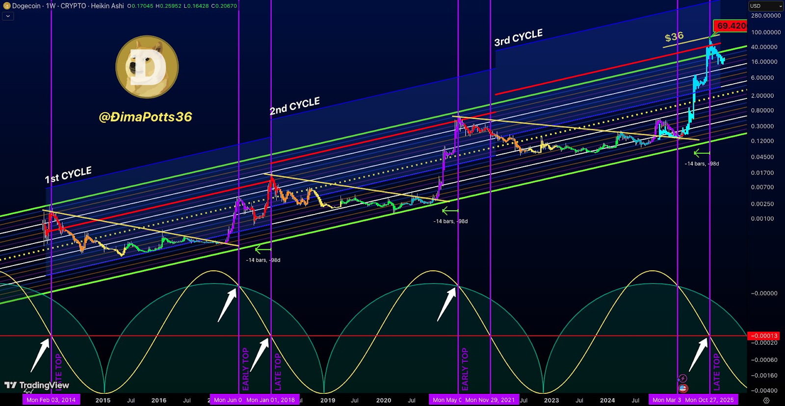 Chart analysis indicates Dogecoin may peak around late October 2025, with historical parallels pointing to a price range between $42 and $69.42.
