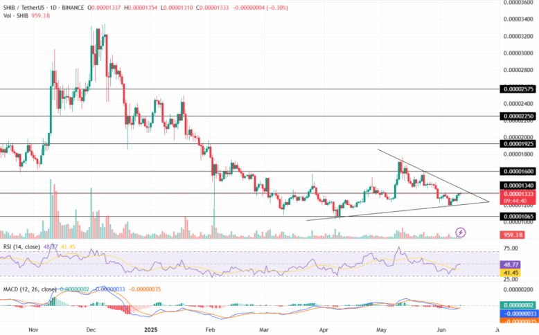 If SHIB can maintain its value above the $0.00001340 resistance level, it could retest the resistance trendline of the triangle pattern. A breakout could lead to upper resistance targets of $0.0000160 and $0.00001925. Conversely, a bearish pullback could test the crucial support line of the triangle pattern.