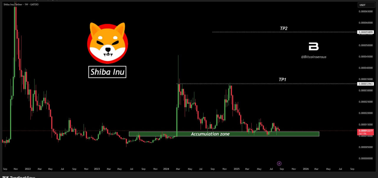 Shiba Inu continues to hover near $0.000013. Analysts have observed that Shiba Inu is still ranging inside its accumulation zone. History has shown that SHIB often explodes after long consolidations. Shiba Inu price prediction now shows targets of $0.00003296 and $0.00005589.