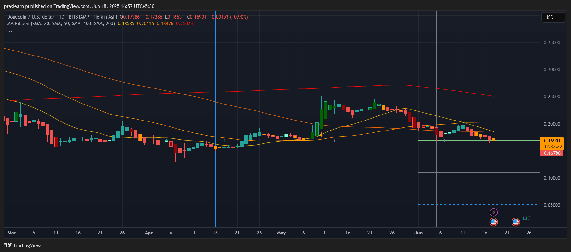 The daily chart reveals a pattern of lower highs and lower lows, with DOGE currently trading below the 20-day ($0.185), 50-day ($0.201), and 100-day moving averages ($0.184). These moving averages now act as resistance levels, adding to the downward pressure. The 200-day moving average, significantly higher at $0.250, suggests long-term trend weakness.