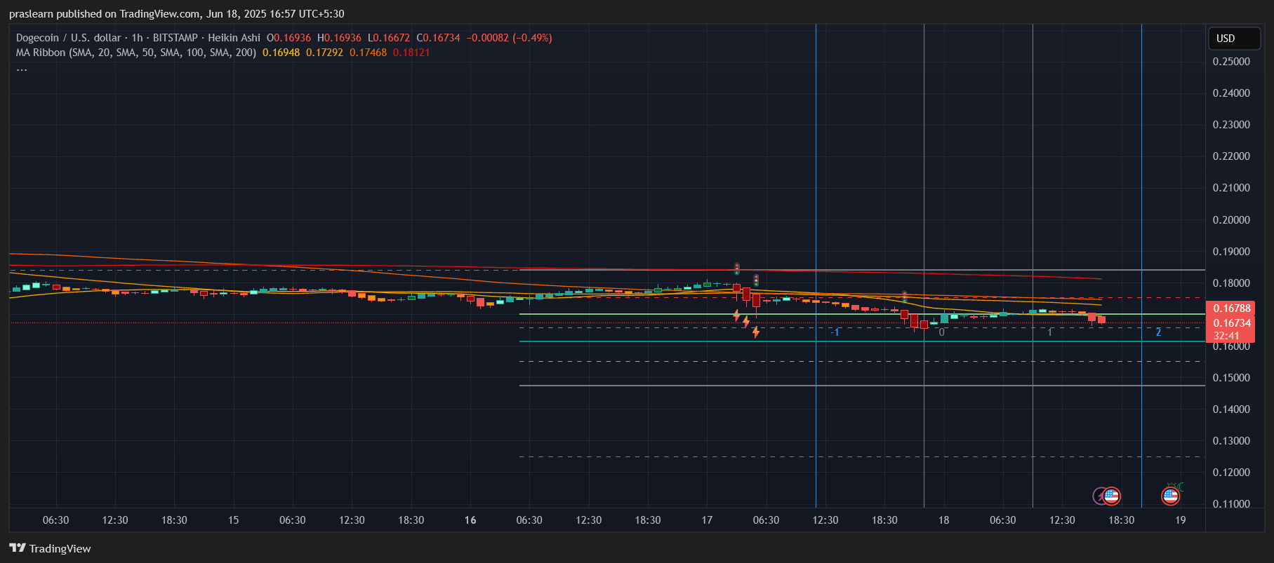 Analyzing the hourly chart, DOGE is trading below all key moving averages: the 20, 50, 100, and 200 SMAs. These averages are closely clustered between $0.169 and $0.181, and the price has faced repeated rejections from this zone, indicating strong intraday resistance.