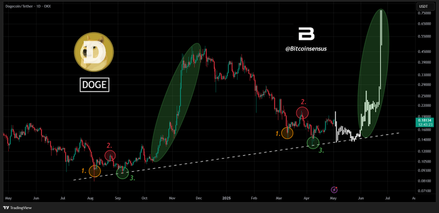 Analysis from Bitcoinsensus reveals two near-identical reversal patterns within the past year. The first, beginning in August 2024, saw DOGE bottom near $0.06 (point 3), subsequently surging past $0.20—a nearly 3x increase. The second, commencing in March 2025, saw a similar bounce from the trendline, with point 3 forming around $0.12. This led to a rally exceeding $0.65. In both instances, the breakouts followed a rebound from the third low in the cycle.