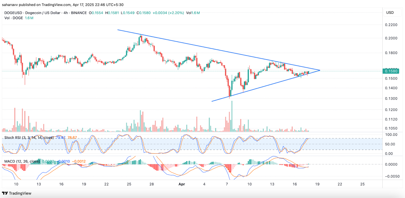 Conversely, the MACD has turned bullish, reflecting increased buying pressure overcoming selling pressure. This suggests Dogecoin (DOGE) may rise to test the triangle's resistance. However, a lack of supporting volume could slow the rally. A break above $0.17 would likely confirm a move beyond bearish influence; until then, the price is expected to remain within its current tight range.