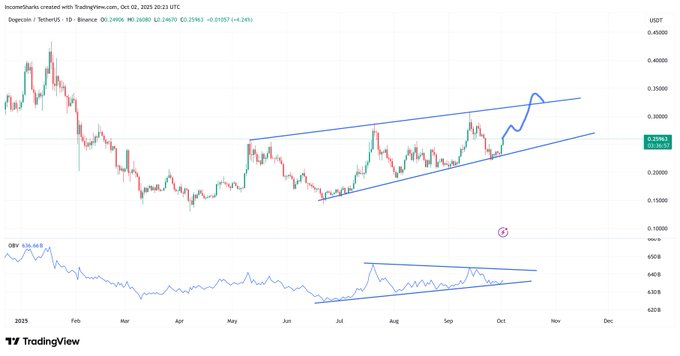 Alongside price, the On-Balance Volume (OBV) indicator is compressing within a wedge pattern. This reflects accumulation pressure building beneath the surface despite price moving steadily within the channel. IncomeSharks notes that OBV breakouts often precede price shifts, suggesting that liquidity movements could guide future direction.