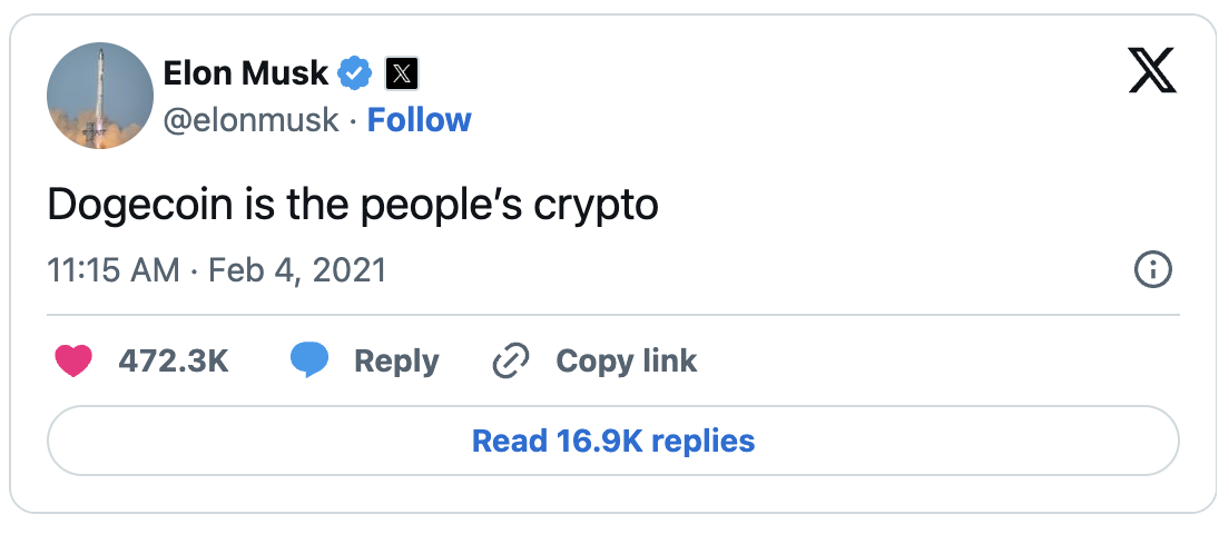 Elon Musk, the CEO of SpaceX and a billionaire, has publicly endorsed Dogecoin for its appealing nature “for the people” and claimed it was different from Bitcoin. His fondness for dogs and memes further strengthens his support. In the past, billionaires like Mark Cuban suggested that Dogecoin could be ideal for transactions due to its token economics.