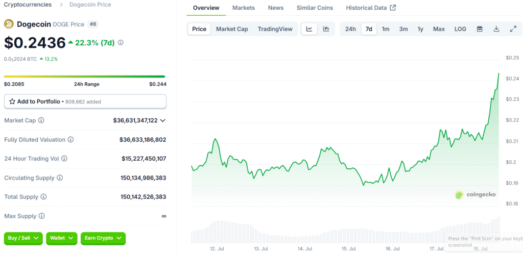 Technical analyses from TradingView further support this bullish outlook, currently signaling a “buy” and projecting a potential long-term rise to $0.3525 by 2031, based on speculative market cap models. The 24-hour trading volume registers at $11.03 billion, accompanied by a 3.20% price increase and a 16.30% gain over the past week, according to CoinGecko. This performance surpasses the broader crypto market's 6.40% increase, emphasizing DOGE's renewed strength within the meme coin landscape.
