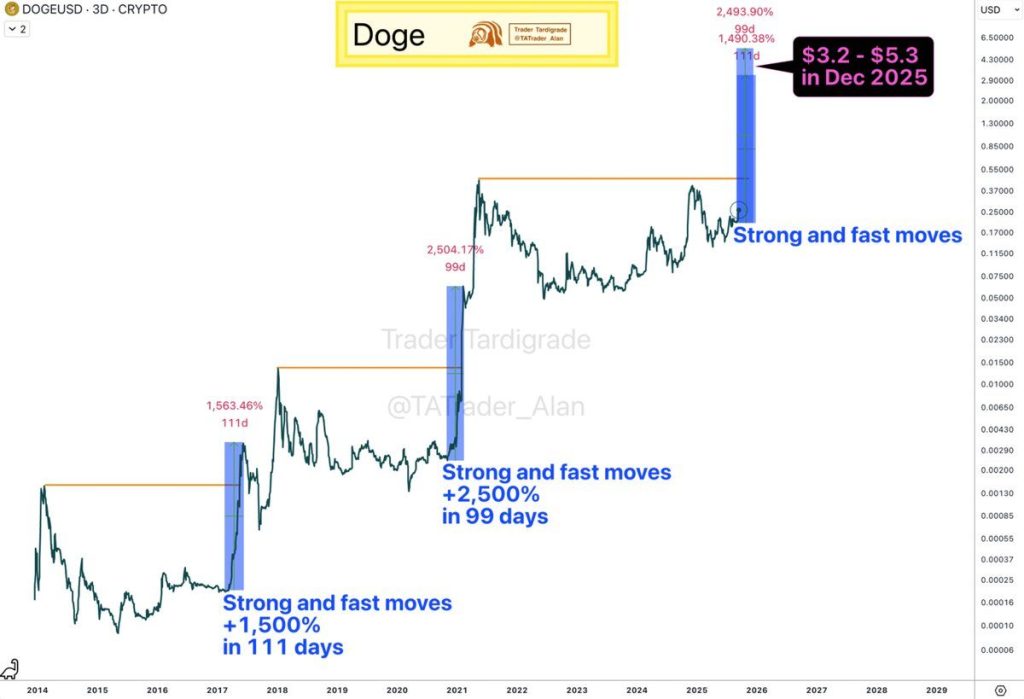 - Historical cycles suggest DOGE could reach $3.2–$5.3 by December 2025 if breakout repeats.