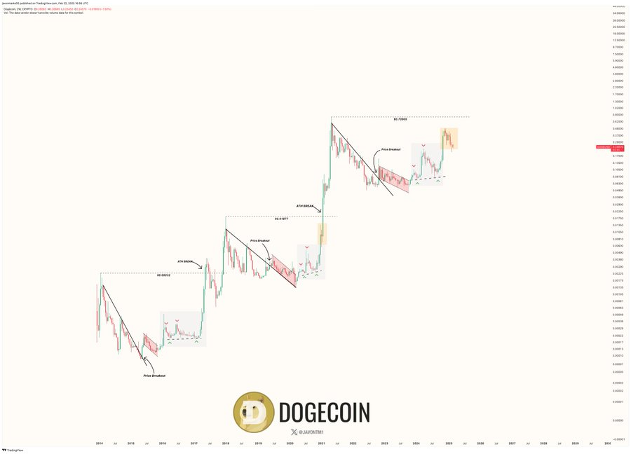 According to analyst Javon Marks, Dogecoin's price history exhibits a cyclical pattern of downtrends, consolidation, and breakouts. Each previous breakout from descending resistance levels has triggered parabolic price movements. The initial major breakout led to a substantial price increase, followed by a cycle of decline and accumulation.