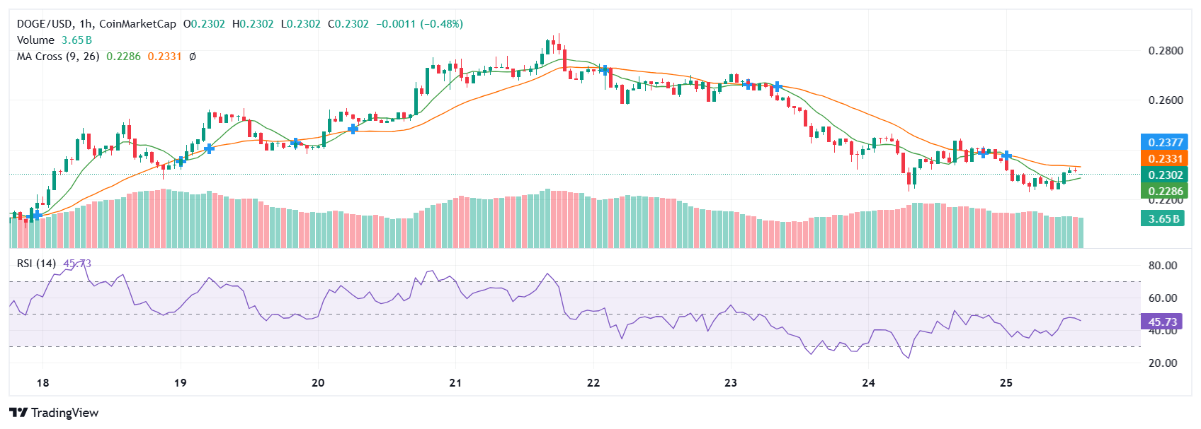 As observed on the Dogecoin hourly chart, utilizing the 9-day and 26-day moving averages, the golden cross is poised to form around $0.2331. A golden cross occurs when a short-term moving average surpasses a longer-term moving average.