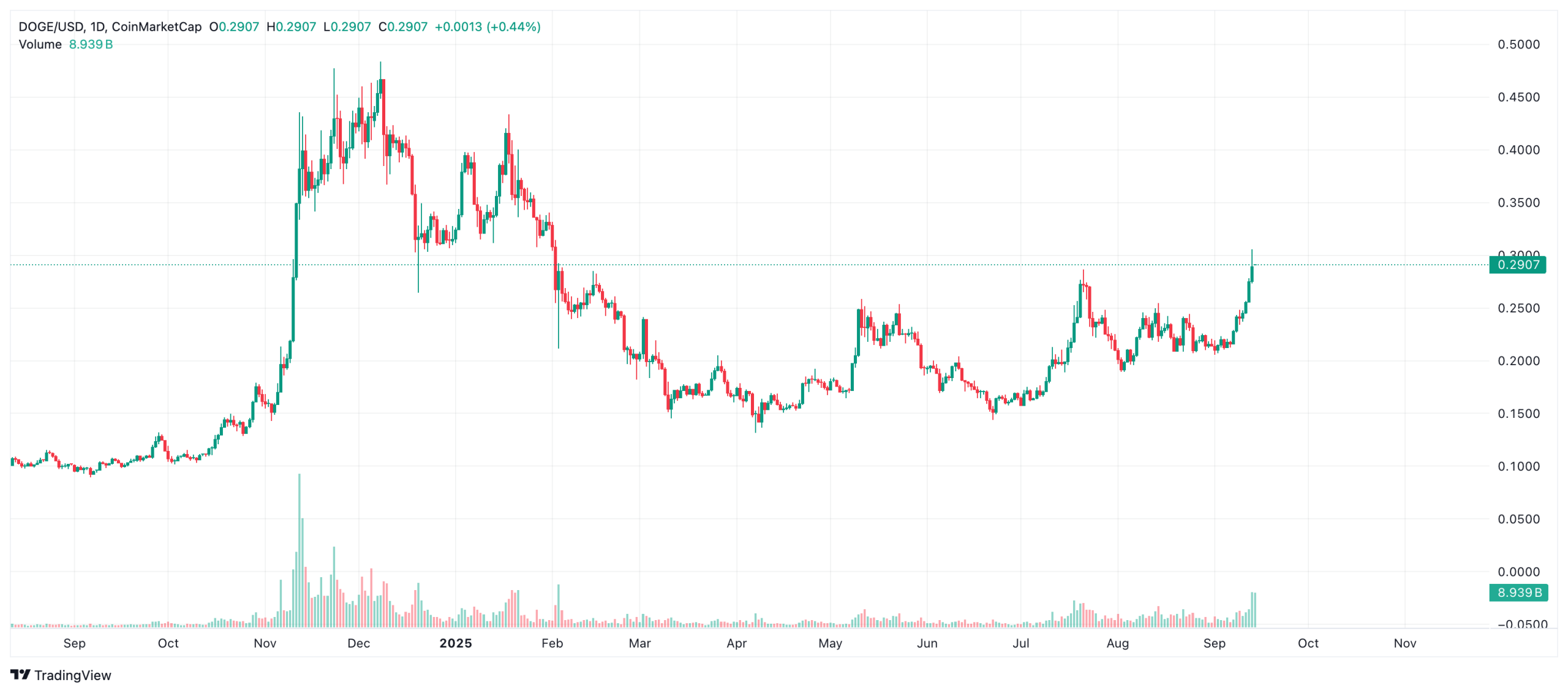 Despite July closing on a high note, Dogecoin saw limited gains in August. However, September, traditionally a weak period for cryptocurrencies, has shown a different scenario for Dogecoin. The current 36% monthly gain represents the highest performance of 2025 so far. This 36% increase is the most robust monthly jump since the 161% surge in November 2024.