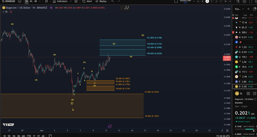 DOGE is approaching the $0.213 resistance level, and substantial volume above this point could confirm a bullish breakout.