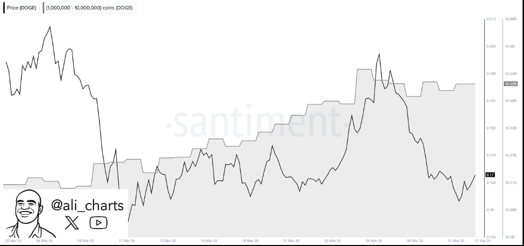 On-chain data reveals substantial Dogecoin purchases by large investors over the past month. Ali Charts data indicates whales acquired over 220 million DOGE in March alone. This significant accumulation suggests high-net-worth investors are bullish on DOGE, despite recent price volatility.