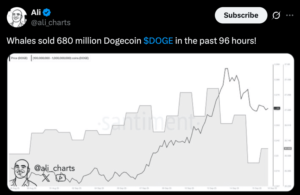 According to latest market reports, Dogecoin has dropped about 13% from its recent high near $0.307 after large Dogecoin whale selloff of around 680 million DOGE over a 4 day period, worth about $181 million. On-chain data from Santiment as reported by analyst Ali Martinez shows large holders with wallets between 100 million and 1 billion DOGE reduced their holdings from 27.4 billion to 26.65 billion DOGE.
