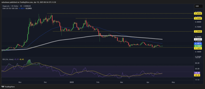 Dogecoin's price is currently trading below both the 50-day and 200-day Exponential Moving Averages (EMAs) on the daily chart, confirming the bearish trend. A bearish crossover between the 50-day EMA ($0.182) and 200-day EMA ($0.224) further strengthens this bearish sentiment.