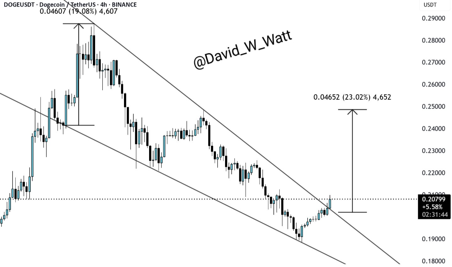 Analysts have observed that DOGE had been confined within a descending channel for several weeks. The breakout candle, which closed above the trendline, has altered the market structure. Moreover, the 4-hour chart indicates clear support forming near $0.21, a level that previously acted as a strong resistance point. Watt suggests that a safer entry point might be a retest of support, but the overall trend now leans bullish.