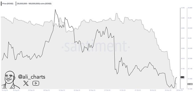 As per on-chain data, wallets that have between 10 million and 100 million DOGE have sold more than 3 billion tokens in the last month. This massive distribution, which is also shared by market analyst Ali is congruent with a significant retracement in prices between the $0.067 area and the new monthly lows. The shift is an instance of profit-taking by mid-sized holders which is normally regarded as a measure of the wider market confidence.The decrease in activity often precedes a phase of price compression or accumulation.
