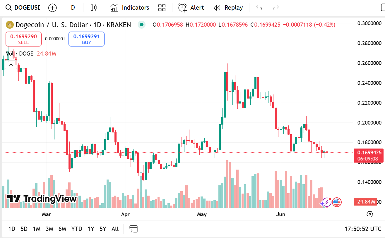 Dogecoin's volume has also declined, falling by 34.06%, although its price has seen a slight increase.