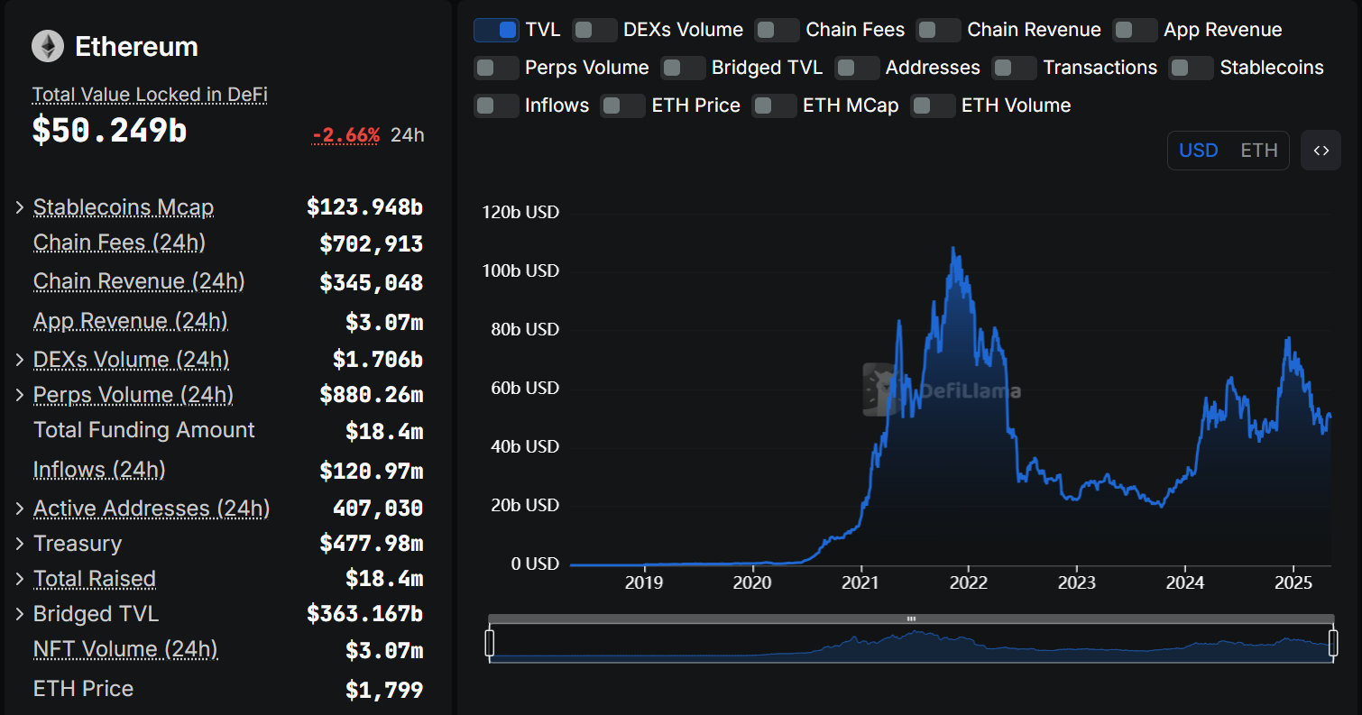 Data from DeFiLama shows a sharp decrease in Ethereum's Total Value Locked (TVL) since its peak of $86.6 billion in December 2022 (its highest since mid-2022). The TVL has fallen to $50 billion, representing a 43% drop in a few months, indicating reduced user activity and capital outflow from Ethereum-based protocols.