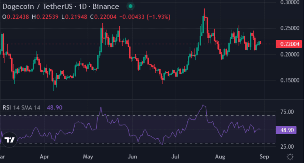 Both the 10-day and 100-day moving averages hug $0.22, signaling tight action. Momentum tools mirror that calm; RSI rests at 44.8, near neutral, while a 27.2 stochastic hints sellers may be spent. The MACD line hovers just below zero, neither bullish nor grim. Taken together, DOGE is coiled and waiting for a shove.