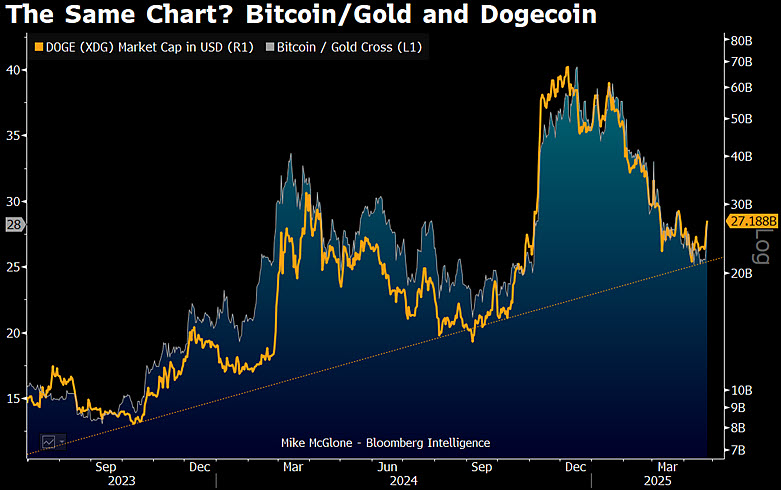 In a recent post, McGlone presented a comparative chart illustrating the parallel movement of Dogecoin and what he terms the "Bitcoin/gold cross." While not a standard technical indicator, this likely refers to a custom metric tracking the relative price correlation between Bitcoin and gold, possibly created by Bloomberg.