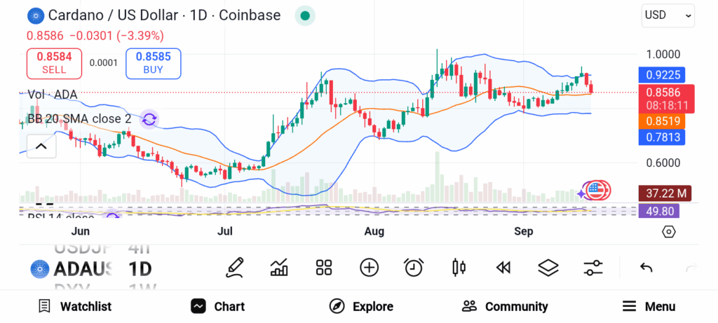 Cardano’s ADA trades near $0.90 after breaking out from a falling wedge pattern. Analysts often view that pattern as a setup for rallies. Some forecasts call for a move toward $1.20 soon and as high as $2.91 over time. Analyst Javon Marks notes that Cardano followed similar cycles before, gaining more than 200 percent after similar breaks.