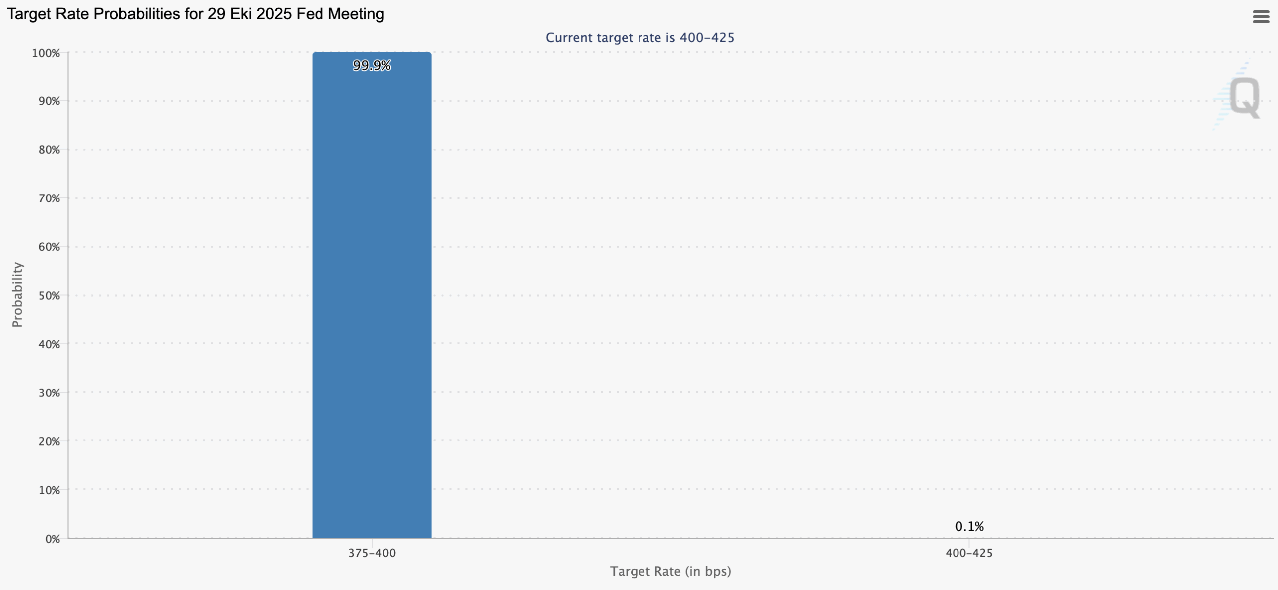 Data from the CME Group’s FedWatch tool implies a 99.9% probability that the Fed will lower rates by 25 basis points. Another 25 basis point cut is expected in December, with an 89% probability projected.