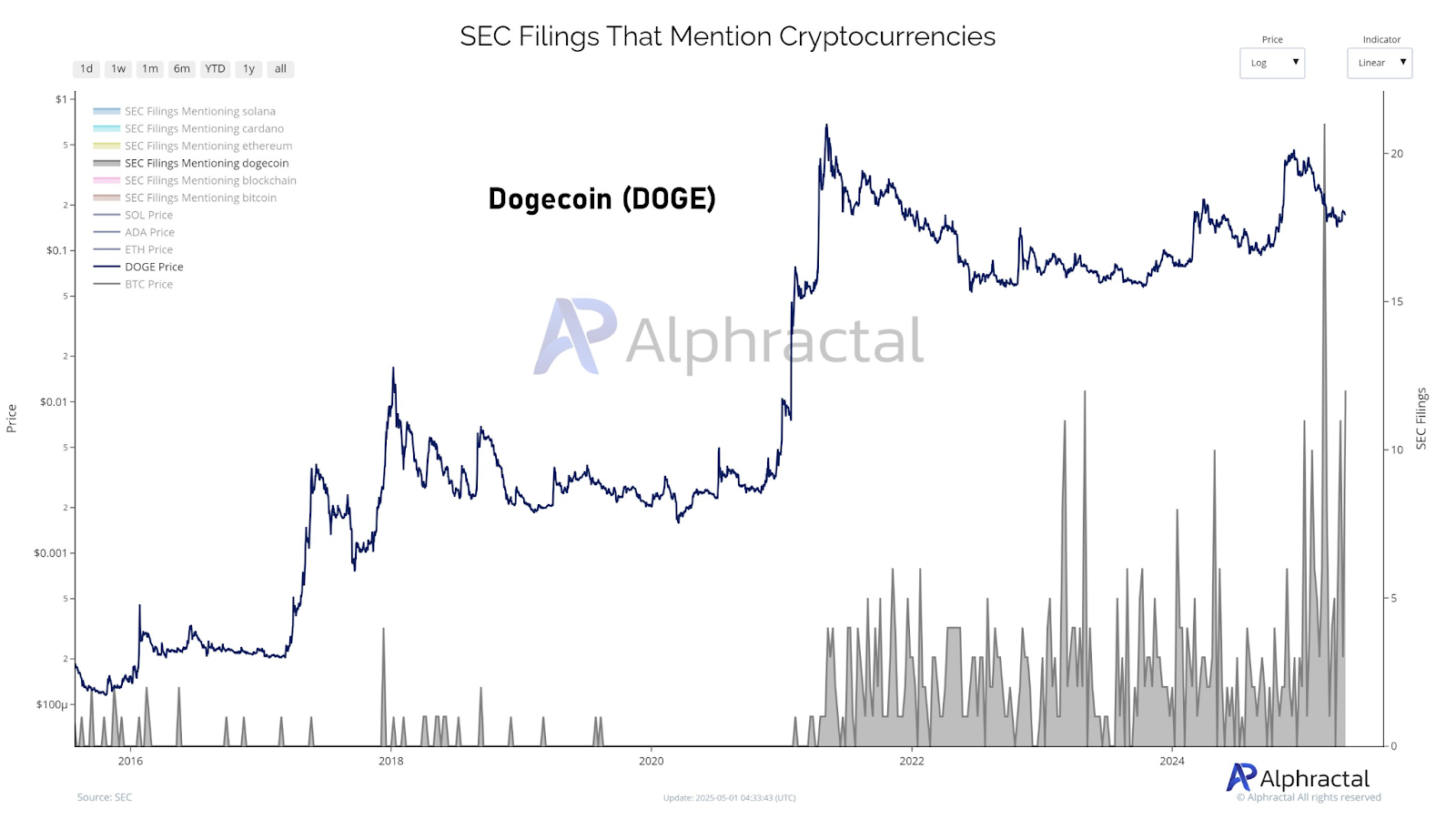According to Alphractal, Bitcoin saw its third-highest week on record for SEC filings, reinforcing its dominance in institutional portfolios. However, recent data reveals a notable shift, with Ethereum, Cardano, and Dogecoin also attracting increased filings.