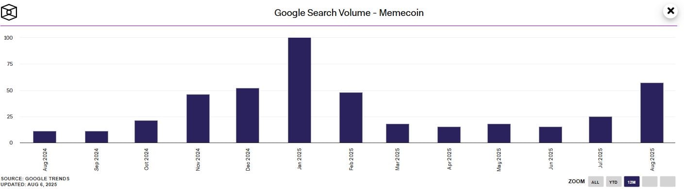 Search interest for the term “memecoin” has rebounded to 57 on Google Trends, after months of muted activity. The figure remains far below the peak of 100 reached in January during the launch frenzy of TRUMP memecoin, but it signals fresh retail attention.