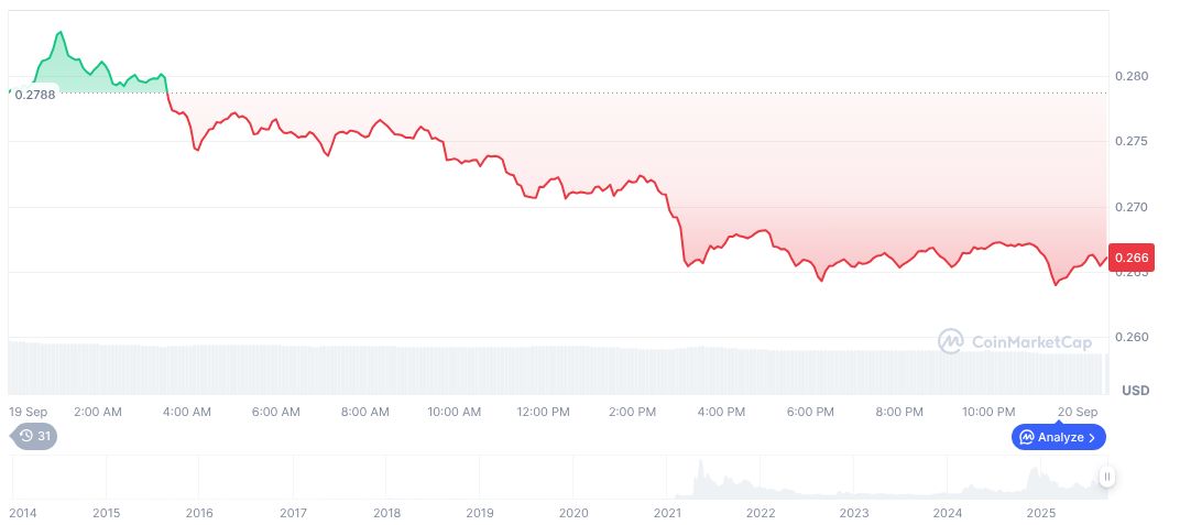 Dogecoin, symbol DOGE, recently traded at $0.27 with a market cap of 40.09 billion. Its 24-hour trading volume stands at 3.39 billion, reflecting a decline of 20.14%. The token experienced various price changes, namely a 5.07% drop in 24 hours and a 70.12% rise over 90 days, CoinMarketCap reports.
