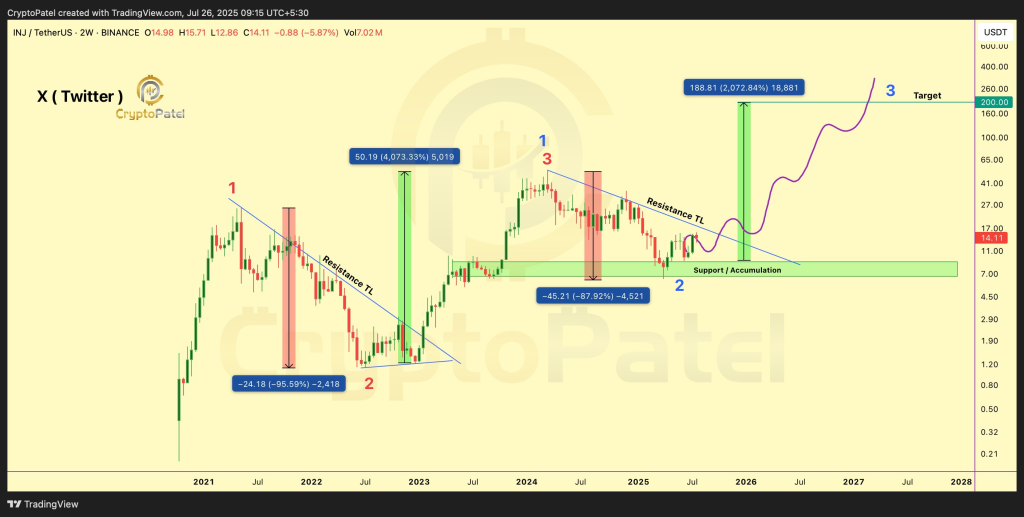 Crypto Patel notes that the breakout level this time is just above $17. If Injective surpasses that resistance trendline with sufficient volume, the technical pattern would be confirmed, potentially triggering a third wave. This could mark the commencement of the projected move towards the $200 region.