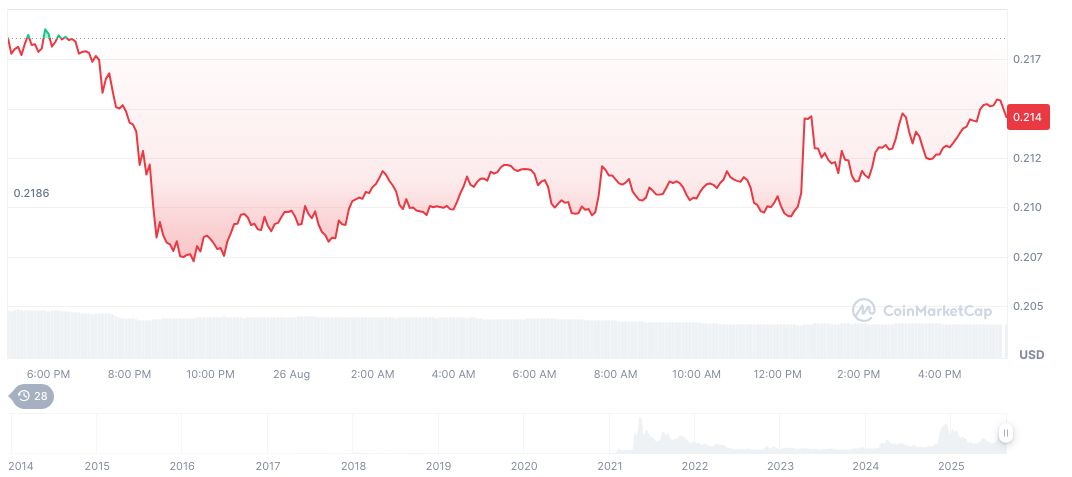 As of the latest data from CoinMarketCap, Dogecoin (DOGE) shows a current price of $0.21 with a market cap of $32.38 billion. Its trading volume over the last 24 hours reached approximately $2.99 billion, despite a significant decline of 28.72%. Dogecoin maintains 0.85% market dominance and has a circulating supply of 150.68 billion. In terms of price fluctuation, Dogecoin experienced a decline of 1.54% in the past 24 hours, a slight increase of 0.32% over seven days, but fell 9.93% in the last 30 days. Interestingly, over 60 days, its price surged 34.28%. These figures reflect Dogecoin's resilience amid changing market conditions as of August 26, 2025.
