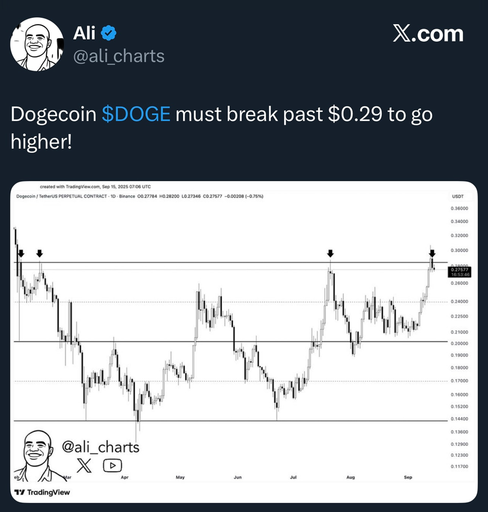 The $0.29 line has stopped Dogecoin price rallies several times this year. Analyst Ali Martinez said the coin must close above this line to continue higher.