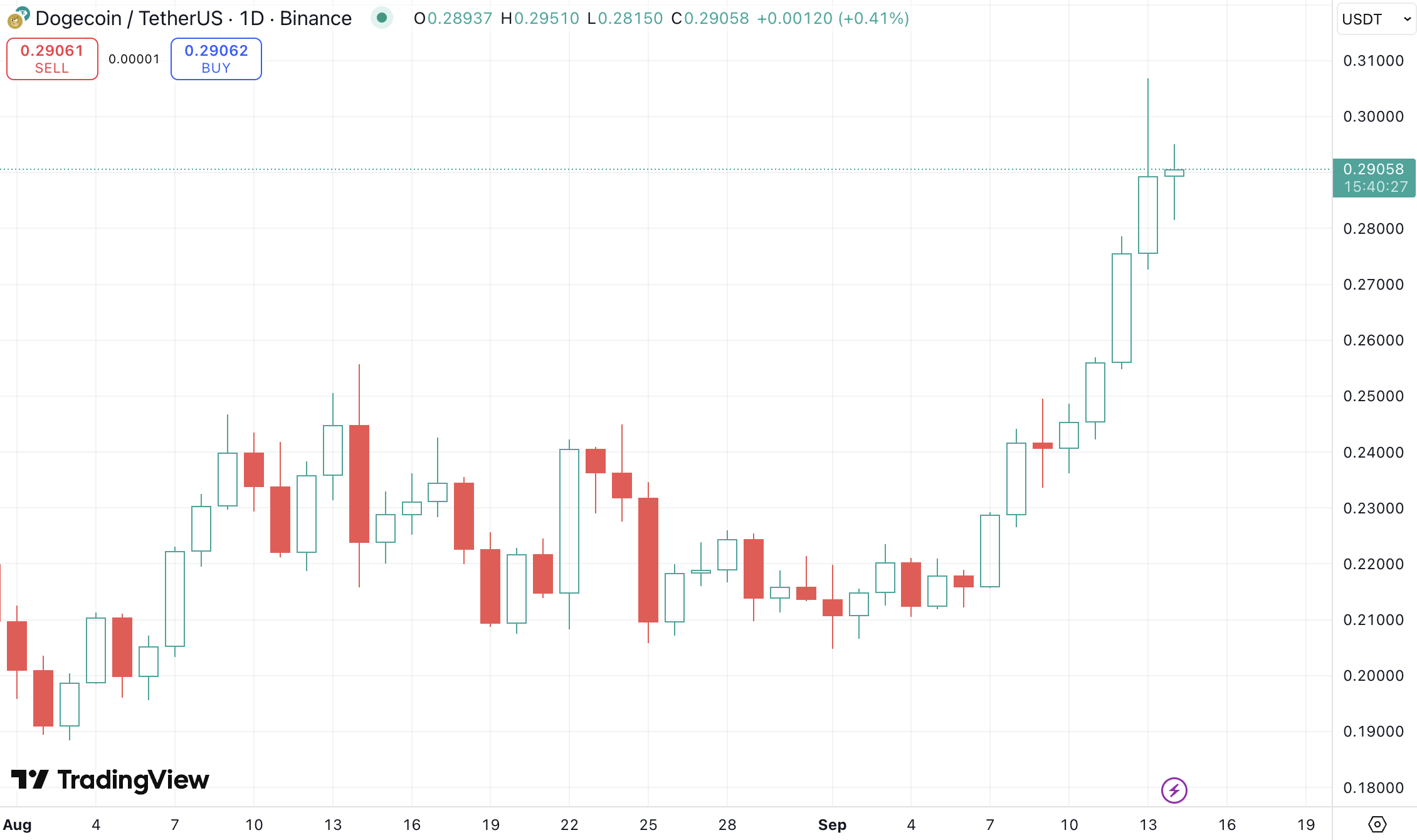 Now, September, despite being a historically bearish month for cryptocurrencies, is on track to be Dogecoin's best month of 2025 with a current gain of roughly 36%. This is on track to be Dogecoin's best month since November 2024, when it soared by more than 161%.