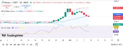 Market analysts have noted that Manyu’s decline may represent a cooling phase following a strong rally. However, failure to reclaim the 0.36e-7 resistance could deepen bearish sentiment in the coming days. Sustained trading below the 20-day simple moving average might open room for further declines toward lower Bollinger Band levels.