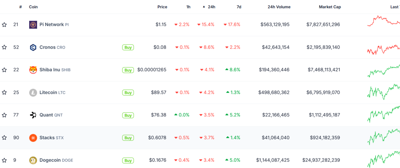 Two of the ten worst-performing coins in the top 100 are major meme coins. Dogecoin (DOGE), the original meme cryptocurrency, is down 3.4%, falling to $0.1676 and losing $875 million in market capitalization overnight.