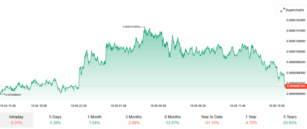 Dogecoin trades near $0.00000974 after recording a slight intraday decline of 0.31%, reflecting short-term adjustment following recent advances. Over the past five days, the coin has gained 4.39%, signaling persistent interest within a narrowing range. However, despite a six-month gain of 53.87%, its year-to-date performance remains weaker due to earlier broad market sell-offs.