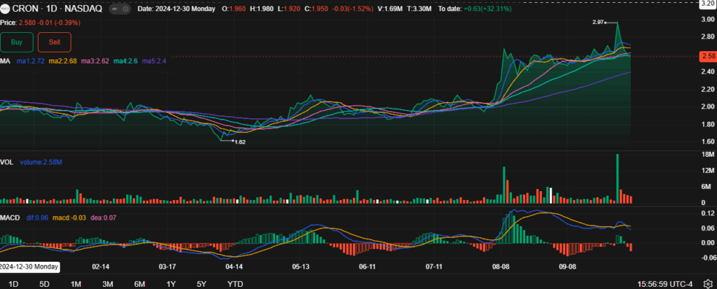 Cronos on NASDAQ trades near $2.58, consolidating after a robust rally that lifted prices from $1.82 to a peak of $2.97. The stock maintains a 32% year-to-date gain, reflecting ongoing structural recovery in the cannabis-linked equity market. However, reduced trading volume and flattening MACD readings indicate easing momentum after a sustained upward cycle.