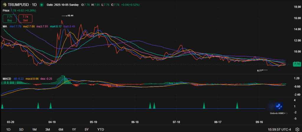 TRUMPUSD trades at $7.78, showing initial signs of stabilization following a sharp decline from April highs above $18.44. The chart indicates flattening moving averages and subtle MACD convergence, both suggesting that downward momentum has started to ease. The token’s movement near $7.70 reflects a potential equilibrium between buyers and sellers after extended weakness.