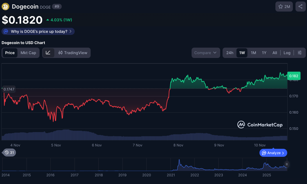 Dogecoin is currently at $0.18, while Pepe and Shiba Inu are up, indicating that the meme beta is waking up as sentiment stabilizes.