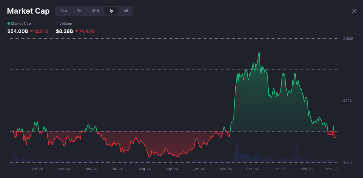 According to CoinMarketCap, the total memecoin market capitalization was $54 billion on March 5th, a 56% decrease from $124 billion on December 5th, 2024. The market peaked at $137 billion on December 8th, experiencing brief fluctuations following memecoin launches by Donald and Melania Trump in January.