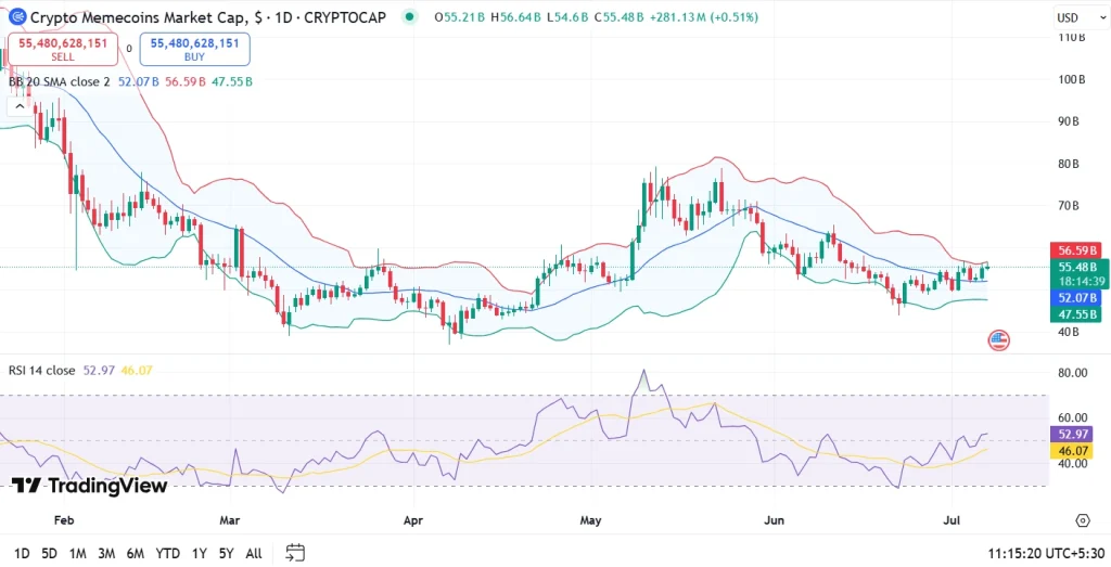 The market capitalization of the memecoin category has jumped to $55.5 billion, reflecting a 5.46% increase in the last 24 hours. Trading volume has also seen a substantial rise of 64.24%, reaching $7.34 billion. The daily chart indicates a potential breakout above the 20-day SMA at 52.07B, while the Relative Strength Index (RSI) stands at 52.97, suggesting increasing bullish momentum. The tightening Bollinger Bands hint at an upcoming volatility spike, likely in an upward direction.