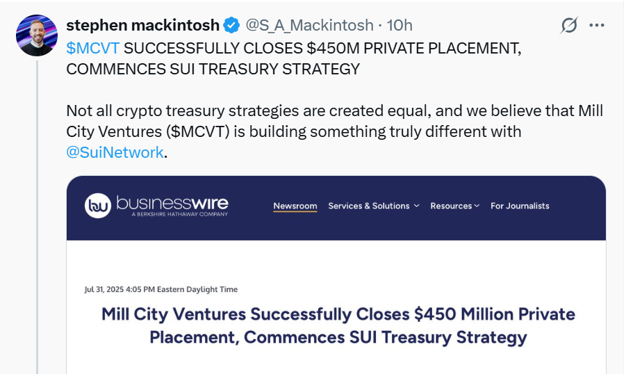 In an X post, Stephen Mackintosh, Chief Investment Officer at Mill City Ventures, described the strategy as a "clean, liquid" avenue for public markets to access digital assets. He further noted that the token's Move-based blockchain is designed for speed and scalability, making it ideal for institutional investment. "Don't sleep on this shift," he advised.
