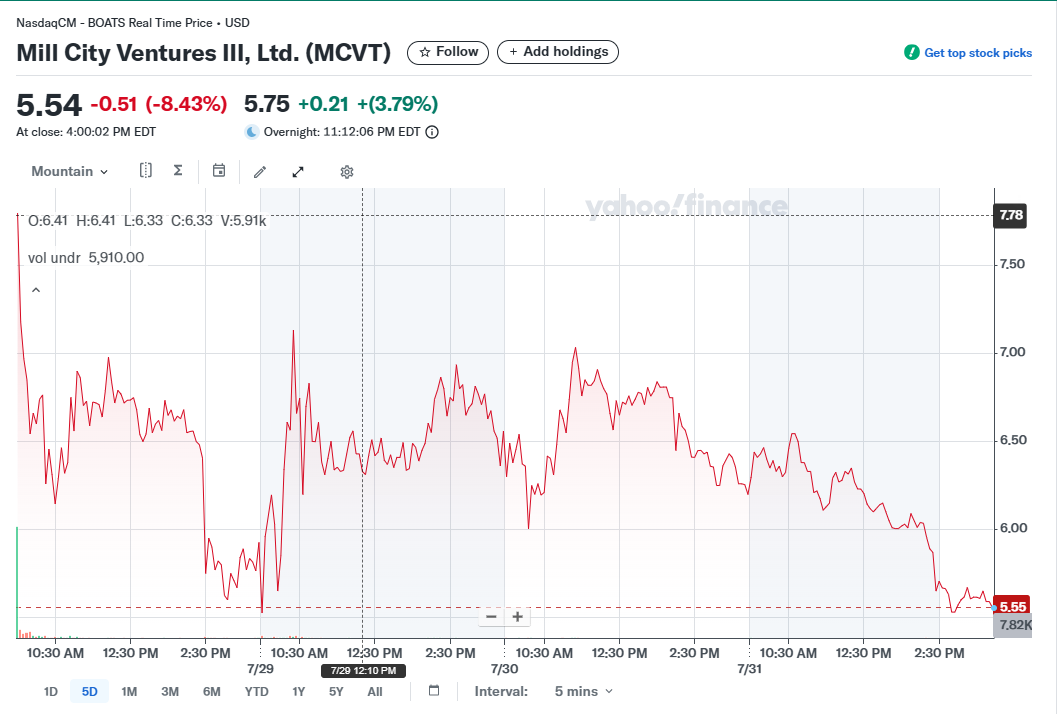 Mill City Ventures' stock price currently stands at 5.54, with a market capitalization of $33 million. The company experienced an 8% decrease in its stock price compared to the previous day's close. The announcement of the $450 million investment in Sui triggered volatility in the share price. Following the news, the price initially surged to 7.78 before declining to 5.55 on the same day. The investment in SUI raises the question of whether it is a contributing factor to the recent stock price fluctuations.