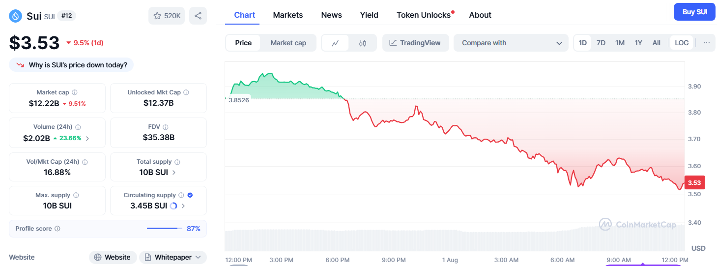 As of the time of writing, the token is trading at $3.53, reflecting a 2.97% decrease. Over the past 24 hours, it has experienced a notable dip of 9%. The current market capitalization is $12.17 billion, also showing a 9.75% decrease from the previous day, according to CoinMarketCap data. Over the past week, the coin has fluctuated between $3 and $4. The overall cryptocurrency market has declined by approximately 3.39% in the last 24 hours. The token's decline is attributed to profit-taking by investors following the price increase spurred by the news of Mill City Ventures' Sui treasury. While institutional inflows are providing support, traders are broadening their risk assessment in anticipation of a potential 30% increase by July 2025. The question remains whether SUI's corporate treasury inflows will stabilize the price.