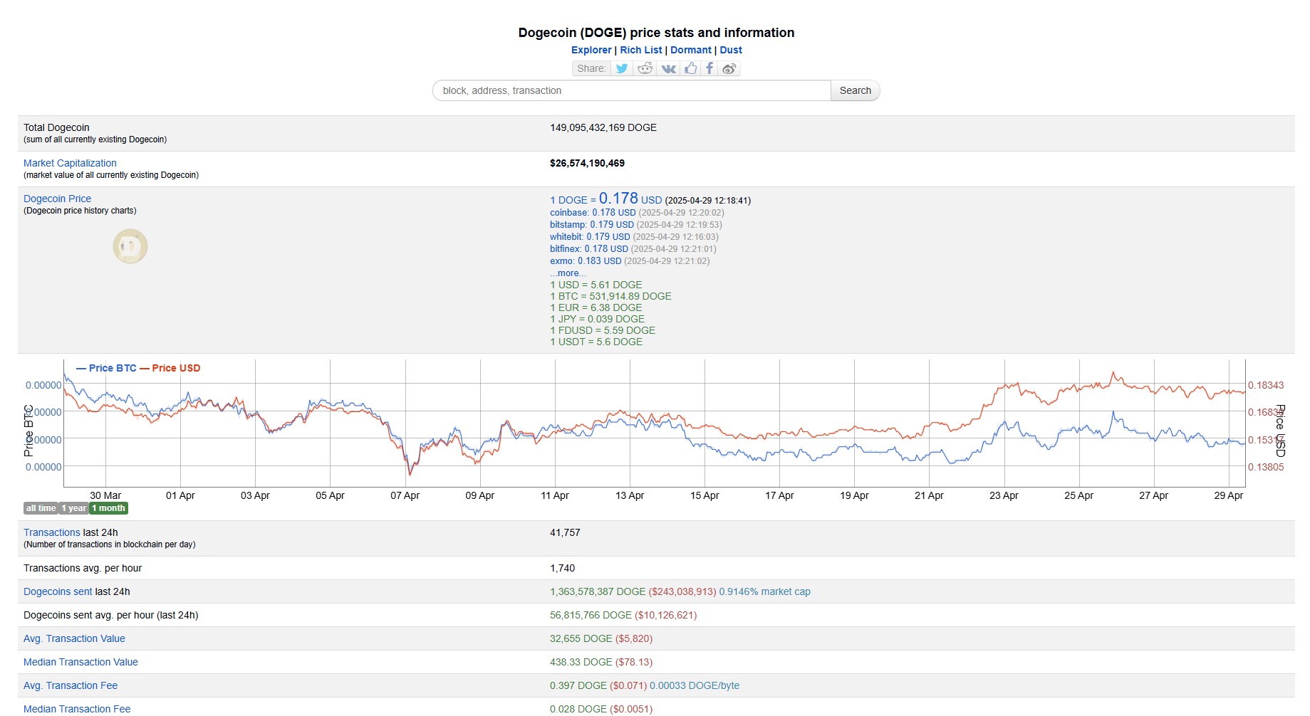 Dogecoin (DOGE), with a market capitalization nearing $26 billion (as of April 29th, according to CoinGecko), is a prominent memecoin. Unlike many others, DOGE is the native token of the Dogecoin network—a proof-of-work blockchain aiming for faster, cheaper peer-to-peer payments than Bitcoin (BTC). It processed over 40,000 transactions in the preceding 24 hours (Bitinfocharts.com).