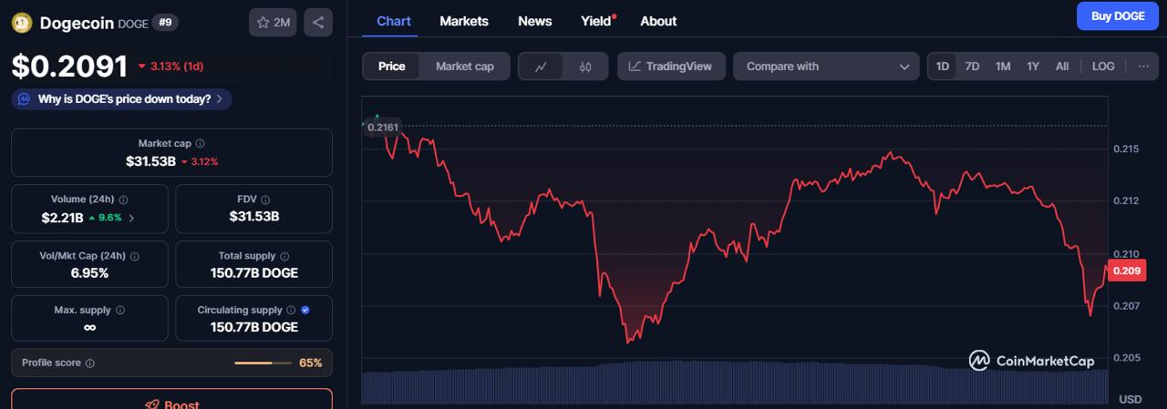 Tracking the ongoing price trend at the time of press, CoinMarketCap data reveals that Dogecoin (DOGE) traded at $0.2091, marking a 3.13% daily decline. The day opened with a peak of $0.2161 before facing steady downward pressure. A short-lived recovery occurred mid-session, but the price failed to regain its earlier high. The decline pushed the market cap to $31.53 billion, a drop of 3.12%.
